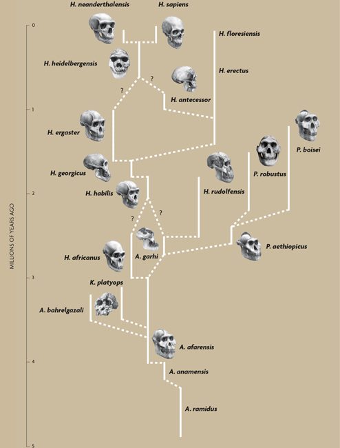 Among other things, this illustration obscures the fact that many of these species overlapped in time and it ignores all our close relatives beyond our direct ancestors.