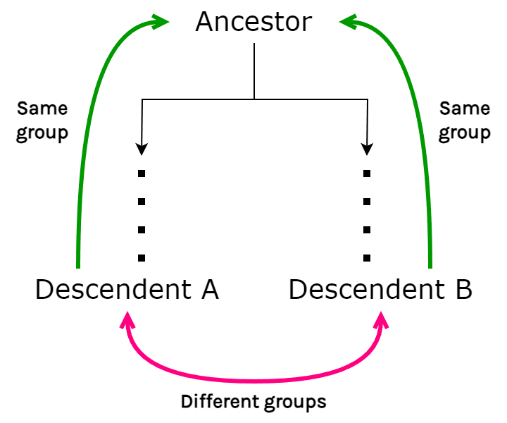 Another mistake creationists make with this line of argument is assuming that macroevolution requires a line of organisms to go from one kind to another. This contradicts the law of monophyly, which roughly states that any organism must be the same kind as its parents. Speciation does not occur when an organism goes from being one species to being a different species; it happens when a single species diversifies enough that two of its descendants, though still the same kind of organism as their common ancestor, are not the same species as each other.