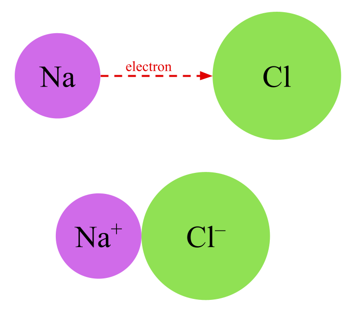 An ion is an electrically charged particle, often an atom with a “missing” or “extra” electron. Molecules can be held together by ionic bonds in which oppositely charged atoms are attracted to each other by electrostatic forces. A common example of a substance with an ionic bond is table salt— sodium chloride or NaCl. The positively charged ion is called a cation and the negatively charged ion is called an anion. In table salt, Na+ is the cation and Cl- is the anion.