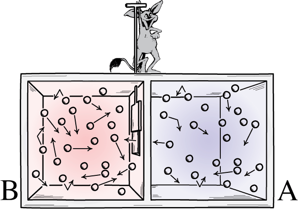 There is a thought experiment we can do with this, called Maxwell’s demon. Imagine we have a container with hot and cold gas, and in the center there is a partition which can be opened for closed to allow gas to go through to the other side. Assume this is an isolated system. If the partition is initially closed and the hot and cold gas separated, this is a low-entropy state. When the partition is opened, entropy will increase as the gas begins mixing until it is in thermal equilibrium. However, even at this point individual gas molecules will be moving at different speeds. Temperature has to do with the average speed of molecules. What if some clever demon could rapidly open and close the partition to only allow fast molecules to pass from right to left and only slow molecules to pass from left to right? Eventually the left side would be dominated by fast-moving (hot) gas and the right side would be dominated by slow-moving (cold) gas, thus entropy would have been reversed in an isolated system. Such a situation would violate the Second Law!