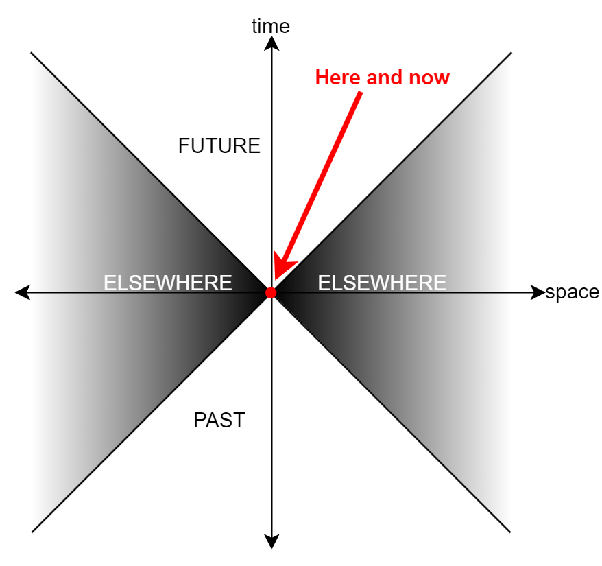 These two diagonal lines represent the speed of light as a relationship between time and distance and define your light cone. The bottom of the cone is the visible past, and the top of the cone is all the times and places you could possibly be in or affect in the future. Outside the light cone there can be no causal interaction. This region of spacetime is simply known as “elsewhere.” It is not possible to travel to, see, or affect “elsewhere.”