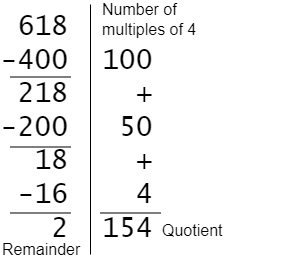 This is based on the Euclidean algorithm which just involves subtracting off multiples of 4 from 618 and keeping track of how many multiples we subtract. It does not actually matter how we do the subtraction as long as we keep track of it.