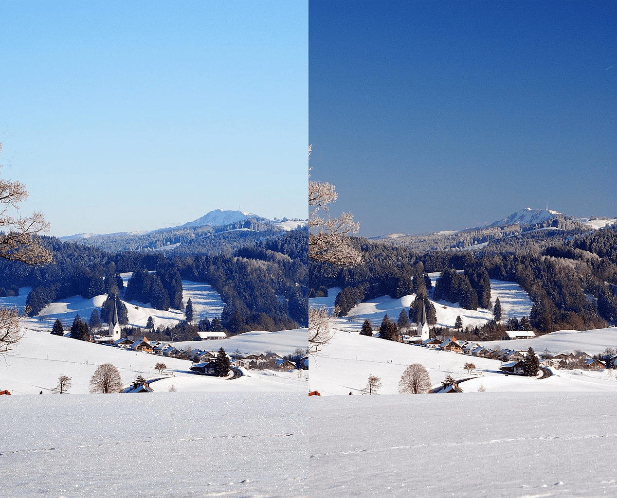 Notice that the most direct sunlight during a sunset is the most reddish, while the diffuse light from the upper sky is still blue.