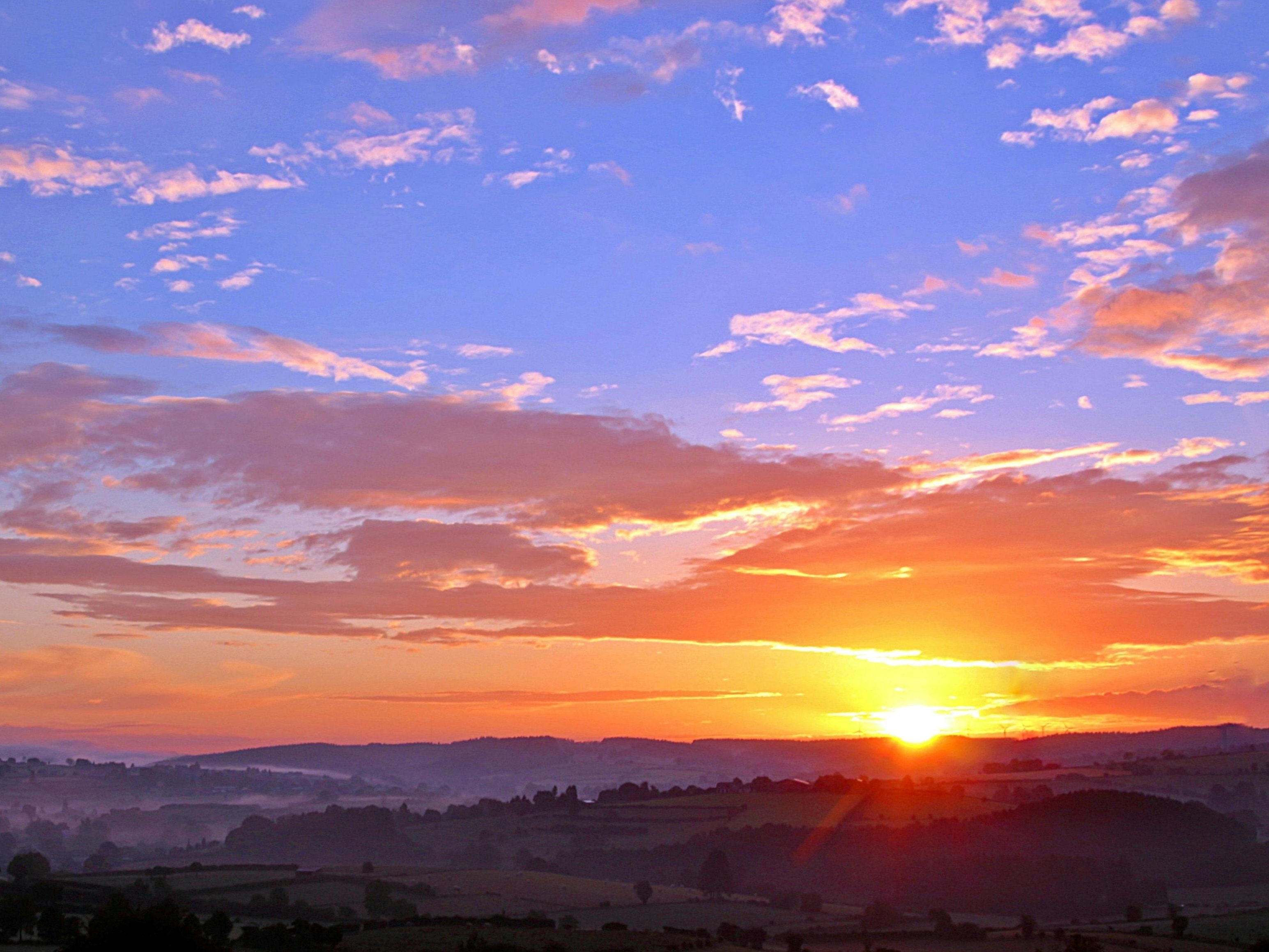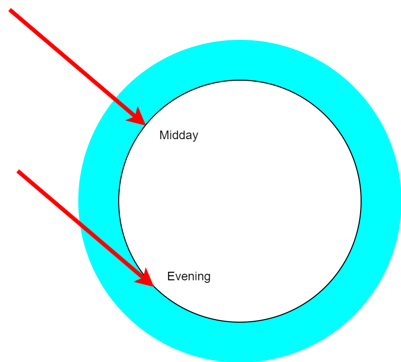 So Rayleigh scattering explains why the midday sky is blue, but it also explains why sunsets are reddish. The later it is in the day, the oblique the angle of sunlight is. At midday, the light from the sun makes its shortest trip through the atmosphere. When the sun is lower, it has more atmosphere to pass through, meaning the light has been scattered more prior to reaching your eye. Looking at the sun through a lot of air means the majority of the blue light has been scattered in other directions before reaching you, and only the longer wavelength (redder) light makes it from the sun to your eye.