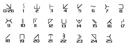 Let’s try writing a message in AL2. We’ll encipher the text “Hello.” The letter H is number 7, so the first symbol is #7 on the chart. The next letter is E, number 4. Now, we have to add 4 to 7, giving us #11. Next is L, number 11. Add 11 and 11 to get #22. Then we have L again, so 22+11=33 corresponding to #7. Finally we get to O, number 14. 7+14 is #21 on the chart. Here’s the final result: