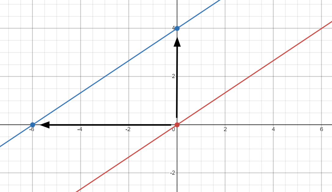 Starting from the line y = 2/3 x, moving left 6 or up 4 gives us y = 2/3 x + 4