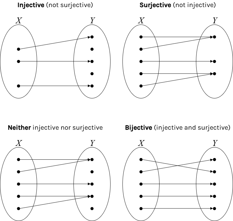 When a function is both injective and surjective, we call it bijective and it means there’s a one-to-one correspondence between the two sets. This can only happen when the sets have the same cardinality. A bijection would be each pigeonhole having exactly one pigeon in it.